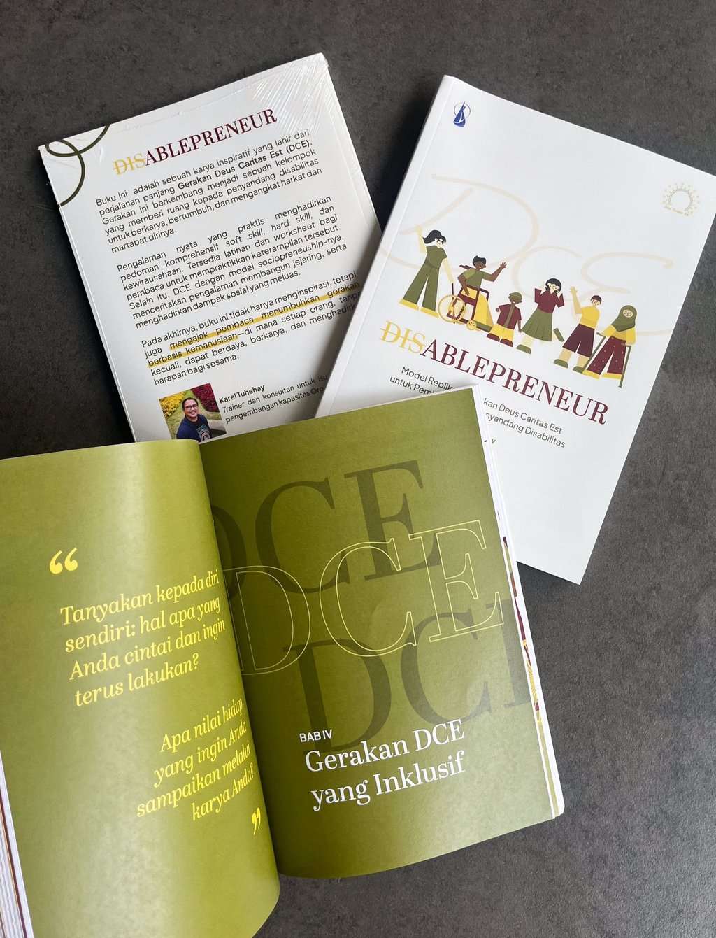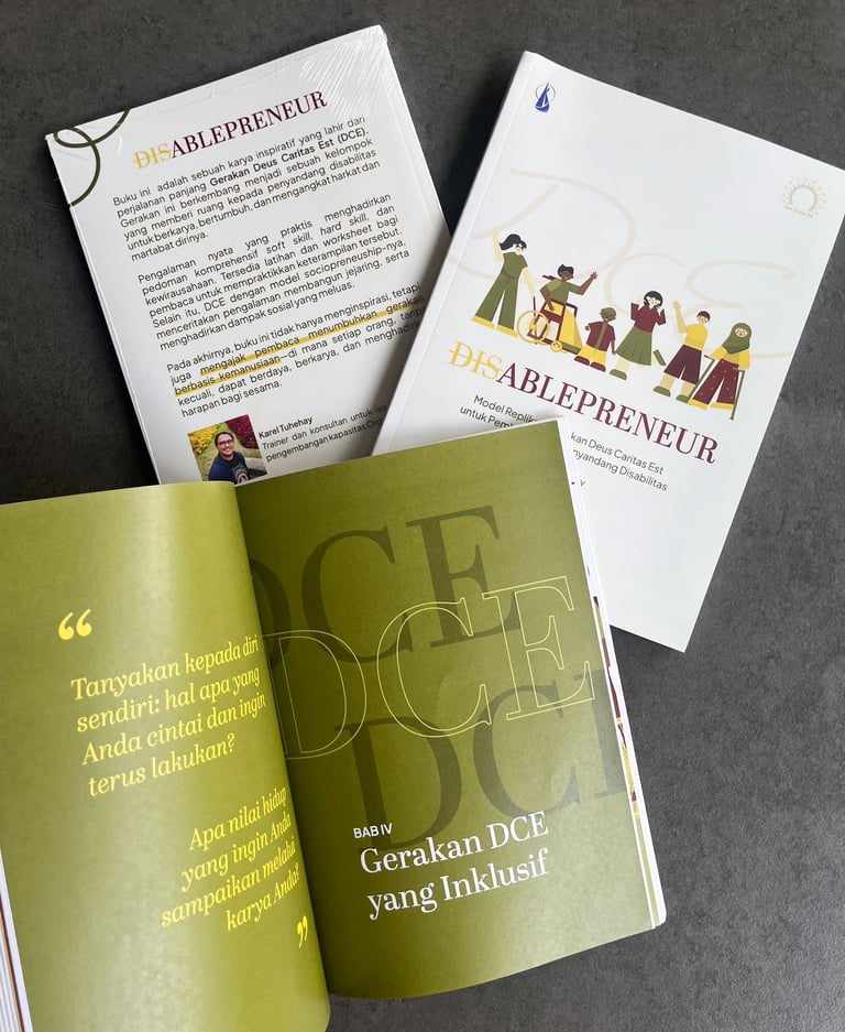 Di awal Agustus 2025, saya ditelepon Ibu Anita yang adalah founder Deus Caritas Est (DCE), inti dari pembicaraan kami ditelepon saat itu adalah, Ibu Anita meminta saya untuk menulis sebuah buku yang mengangkat karya Gerakan DCE serta apa yang dapat DCE sumbangkan kepada penyandang disabilitas di Indonesia, melalui karya mereka itu. Bagi saya, menulis adalah sebuah hobi bahkan pekerjaan saya sehari-hari terutama dalam menulis proposal proyek. Namun menjadi penulis untuk sebuah buku yang “solo writer” bagi saya adalah sebuah tantangan baru yang tidak bisa dianggap remeh apalagi dengan waktu yang singkat untuk menyiapkan kerangka buku lalu kemudian menulis. Keuntungan bagi saya adalah sumber informasi untuk menulis buku ini, secara personal yaitu Ibu Anita, saya sudah kenal sejak tahun 2011, sehingga mudah bagi saya untuk mendapatkan bahan baku dalam menulis.
